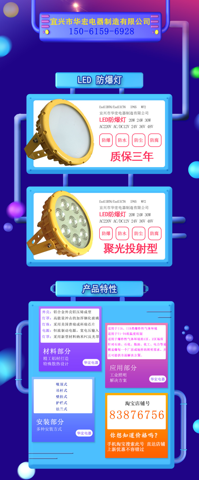 LED防爆灯具提供吸顶式、吊杆式、壁式、支架式(座式)、护栏式、法兰式等各种安装方式,请安需选择合理的安装方式,允许安装角度为水平向下倾30°和90°向下安装。