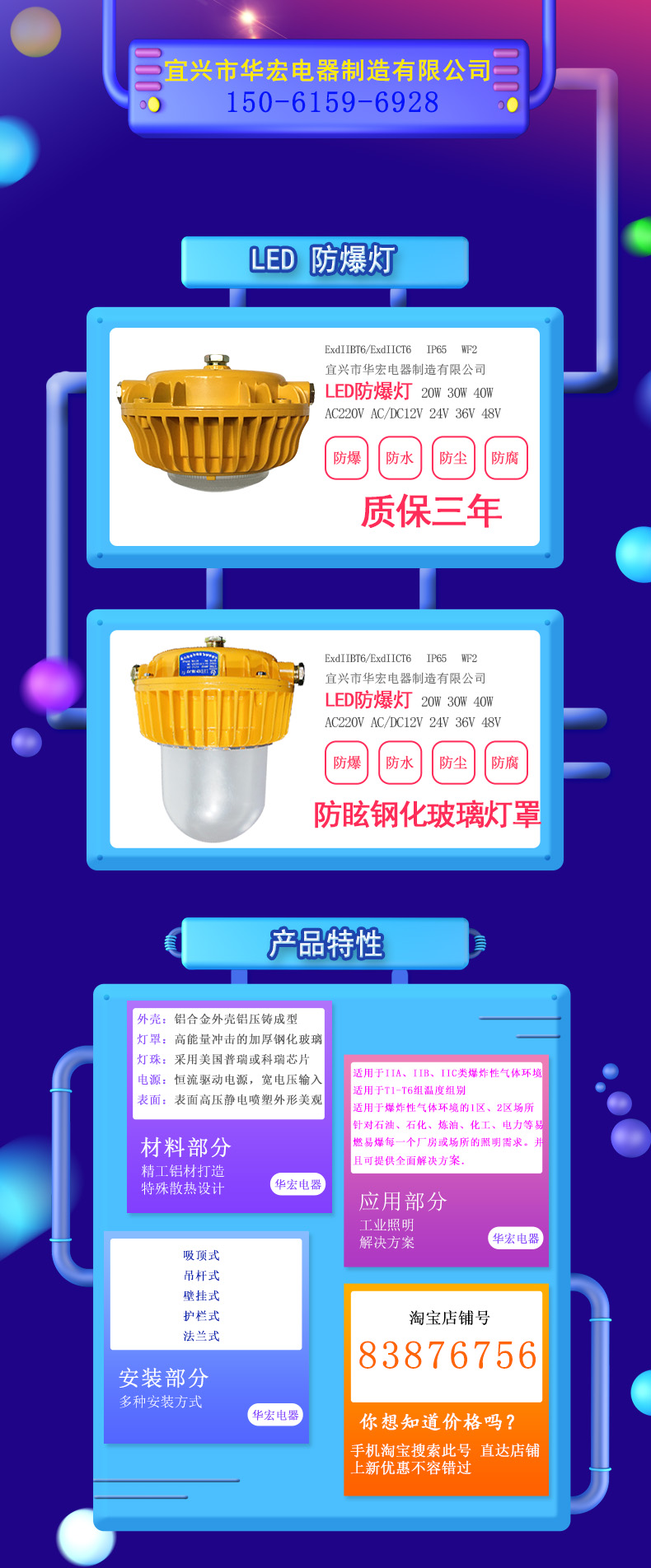 华宏电器品牌50WLED防爆灯厂家灯体采用轻质合金材料,特殊的密封和表面涂层处理,确保灯具在潮湿、高温等恶劣环境中永不腐蚀,永不生锈,不锈钢外露坚固件,透明件采用搞高能冲击的钢化玻璃,灯具为隔爆止口接合面构成,采用优质铝反光杯罩,大大提高灯具使用效率。
